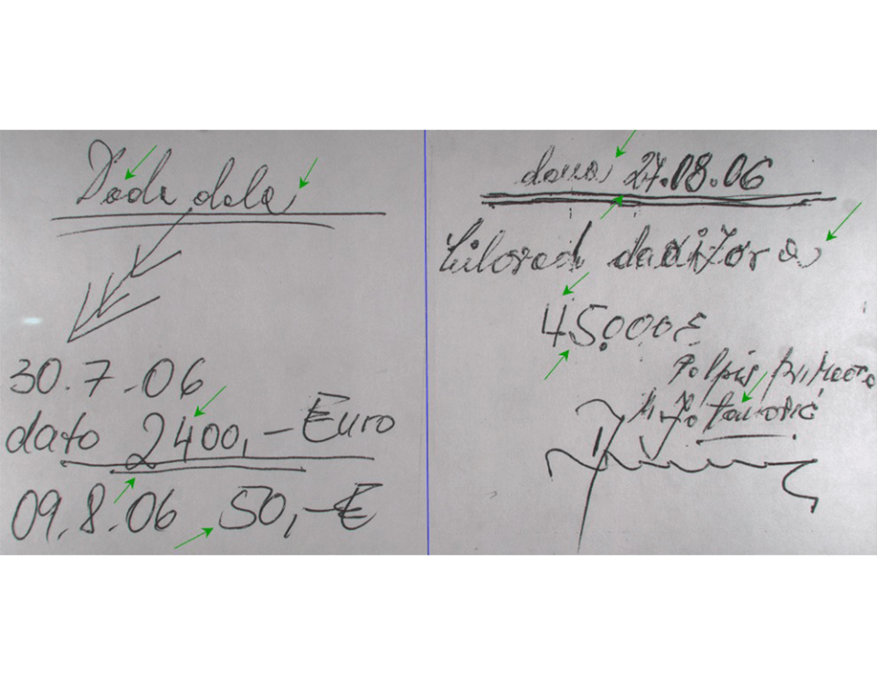 Identifikacioni i registracioni dokumenti, ugovori, testamenti, vrijednosni papiri, bančini, putnički čekovi i kartice, bonovi, listići lotoa, lutrije i sportske prognoze, tapije, obveznice, mjenice, taksene, akcizne, poštanske i sudske marakice, police osiguranja, štedne knjižice, originalnost obrazaca dokumenata, papir/materijal od kojeg je dokumenat sačinjen, identifikacija upotrijebljenog sredstva za pisanje, identifikacija upotrijebljenog uređaja za, upisivanje/otkucavanje/printanje...